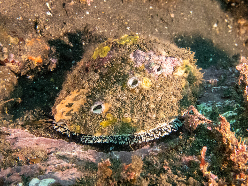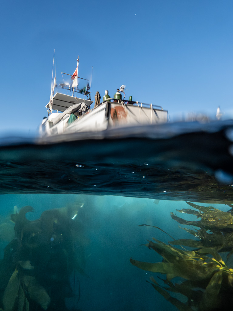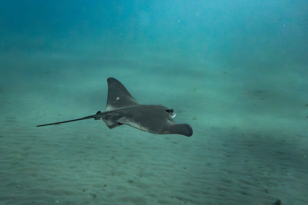 Pretending to forget about my particular ear issue, I dive down to say hi to the adorable bat ray who is calmly swimming along the bottom. Ignoring the pain as I equalize, I manage to snap a few shots. Realizing that I may have pushed a little too far today, I make my way back to the boat feeling very content with my kelp frolicking.