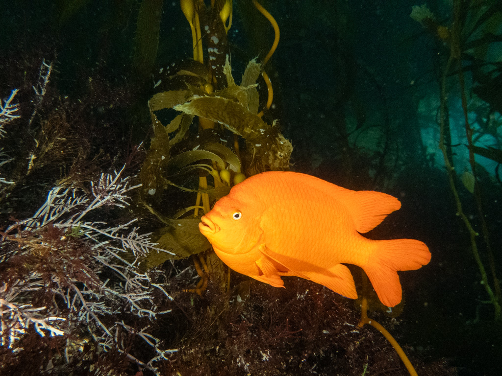 The next day, I still avoid eye contact with my dive gear, but I justify a good surface snorkel. Not even five minutes in, I fall head over heels for the kelp forests. They are everything I imagined and more. With the sunlight streaming in, I have the perfect view down to the bottom. To my delight, a few garibaldi come say hello, and I am somewhat surprised by how unfazed many of the fish are by my presence. The sheepshead are especially curious and approach pretty close to see what I’m up to. At one point, a cormorant even swims below me, chasing some fish, and I can’t help but laugh through my snorkel at the bizarre sight of a bird torpedoing through the water.