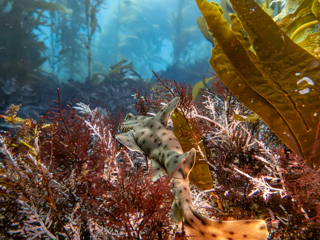Around this time, I’m starting to get a little too toasty in my wetsuit. This is my first time wearing a seal skin wet suit (and also my first introduction into wiggling into them – if you know, you know), and I am shocked by how warm I am. I head back to the boat to take off a layer and then jump back in, already missing the swaying kelp. As the sun hangs lower in the sky, the kelp turns gold, and I can’t help but think of this beautiful ecosystem as a chest bursting with treasure. Bright urchins and shards of iridescent abalone shell litter the floor like jewels, and it’s easy to see why many of these species have dwindled in number because of high demand. Just as I’m sneaking up under a seagull to see how close I can get, a large triangular shape glides under me.