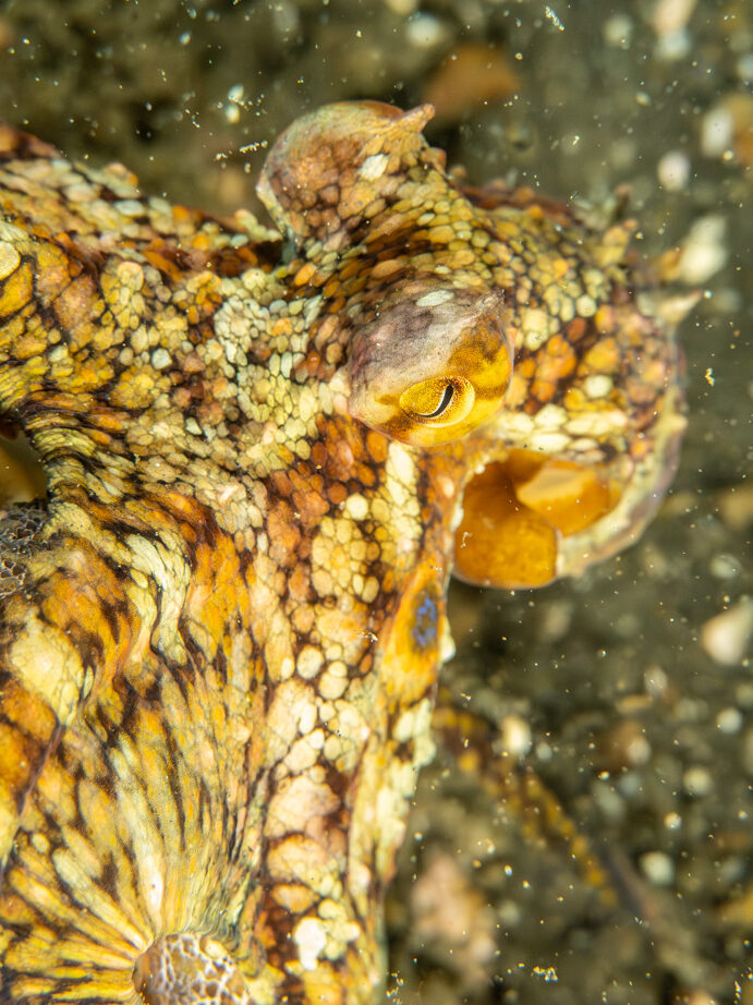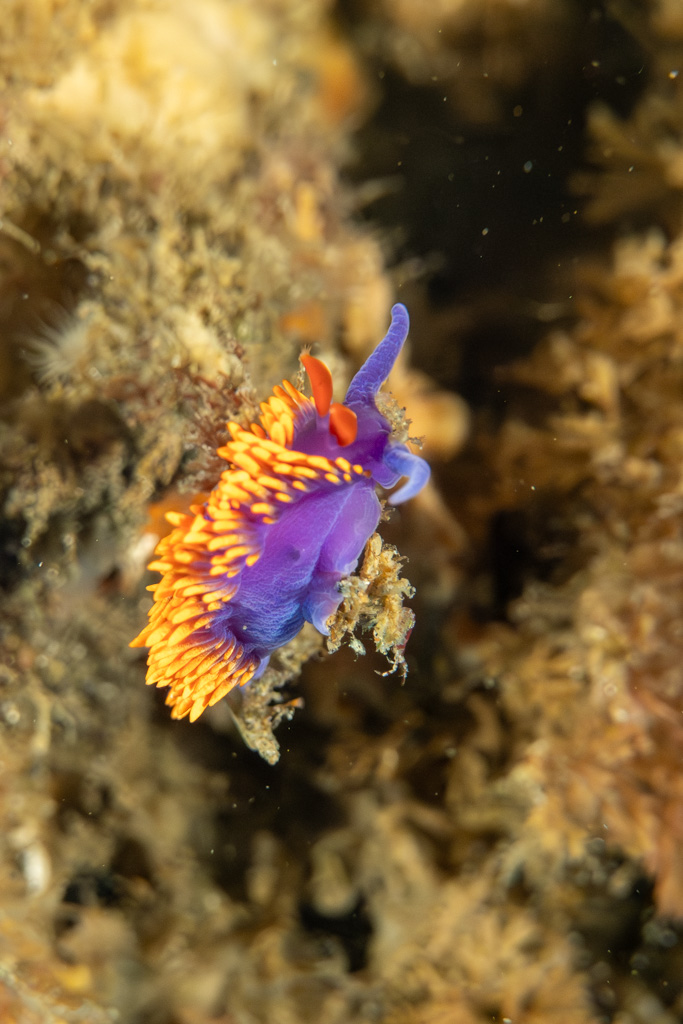 Friday, my last day with KFM, we dive the lighthouse at Anacapa again. I descend this time with Laney as my buddy, and while I never get a visit from the sea bass again, the sea lions don’t disappoint. As Laney is focused on completing her surveying, sea lions and the odd harbor seal cruise by to take a peek at us. Soon enough, I’m distracted by the beauty of the small. Spanish shawl nudibranchs cling to rocks, and I laugh as the raised structures on their backs stream behind them as they are whipped back and forth in the strong surge, like some underwater roller coaster ride. A shy octopus braves my camera to leave its hidey hole and meander between some boulders, giving me a somewhat accusing eye as I follow it.