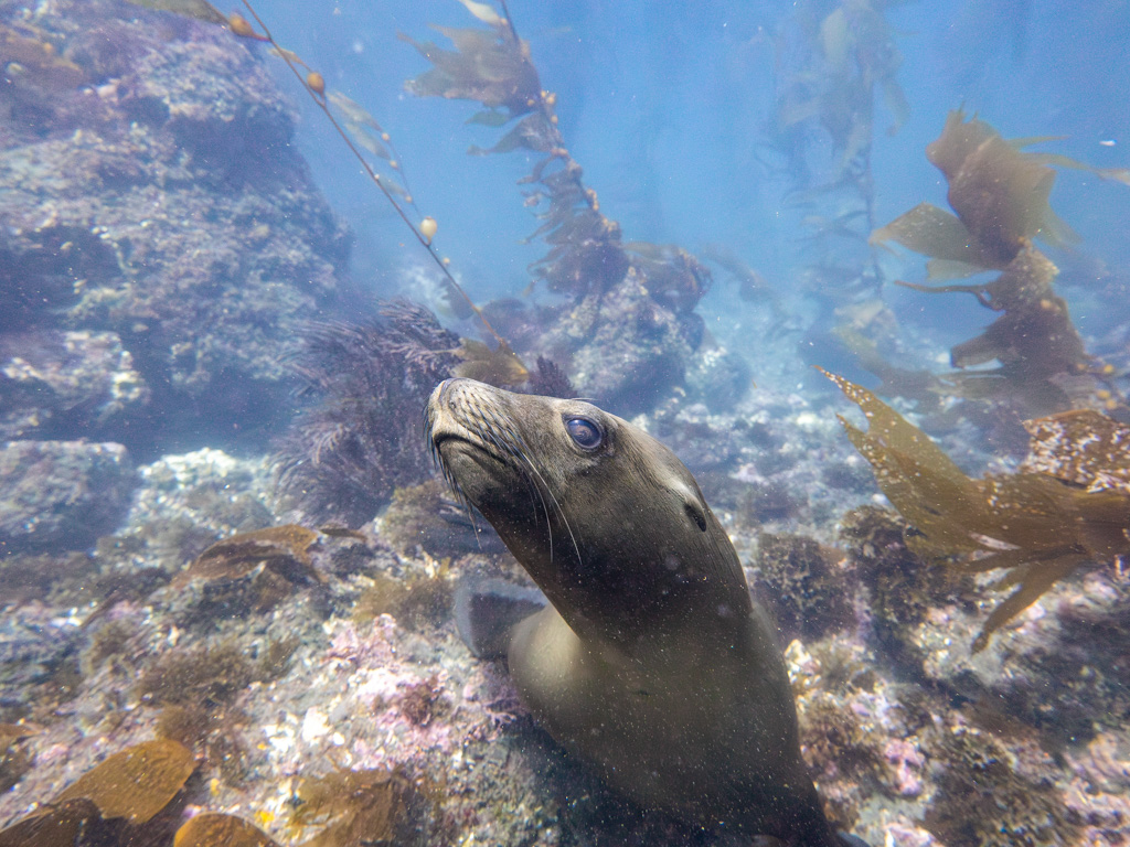 If snorkeling was amazing, my dive was an out-of-body experience. I was gliding through a dreamland of swaying kelp and brilliant red algae carpeting the floor. Bright orange giribaldi flashed in and out of the kelp stipes, and the water was unbelievably clear, revealing complex rocky reef and gorgonians rolling in time to the surge. An octopus peered at me from a crevice, and little horned sharks hid among the red algae. Towards the end of the dive, I get bombed by a sea lion who charges straight at me and blows bubbles in my face before disappearing. Everywhere I look, there is an astounding amount of lush, healthy life. Kenan points out an abalone, and bubbles rush around my face as I squeal in excitement. I’m convinced that I’ve had the most perfect dive ever, and nothing will top it.