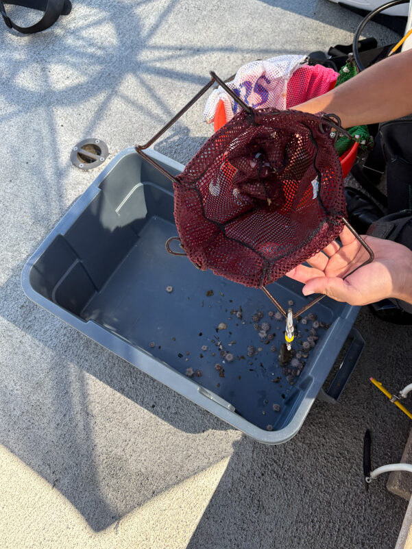 Based on the number of claws we pulled from the trap, Delaina estimates that at least three crabs had been cannibalized, and the smallest of the four had already shown fresh wounds, indicating early attempts. It was a pretty good feeling to return them to the ocean, even if this included scooping them up and then a less than gentle toss overboard to avoid their large claws.