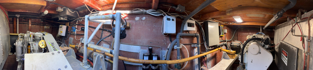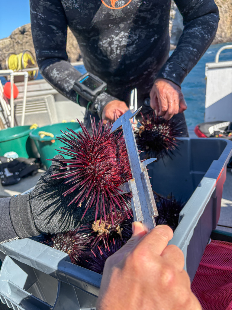 That’s not to say I don’t have a great time my first few days. The seasonal workers for KFM, Lizzie Mceligot, Laney White, Ryan Hallisey, Katie Riley, and Arnel Lorenzo-Orig, are all super welcoming, even though I’m about to take up more of their precious space on board. Throughout the trip, I have a lot of fun with these folks, and it’s possible we trauma bond over some technical issues discussed later. I have free range to an abundance of snacks, which is basically my dream come true after two months of careful food budgeting. Spending all day snacking and diving would be ideal, but I’m still thrilled. I try to make myself as useful as possible, helping divers in and out of the water and assisting with data topside, but to be fair, this team is so self-efficient, I’m hardly any use. I still enjoy getting to see how their diving operations work, and all the little goodies they bring up to measure, like white urchins and abalone shells. Brian Cunningham, our boat Captain, entertains me by showing me the compressor room and has an impressive sixth sense for where our divers are at all times.